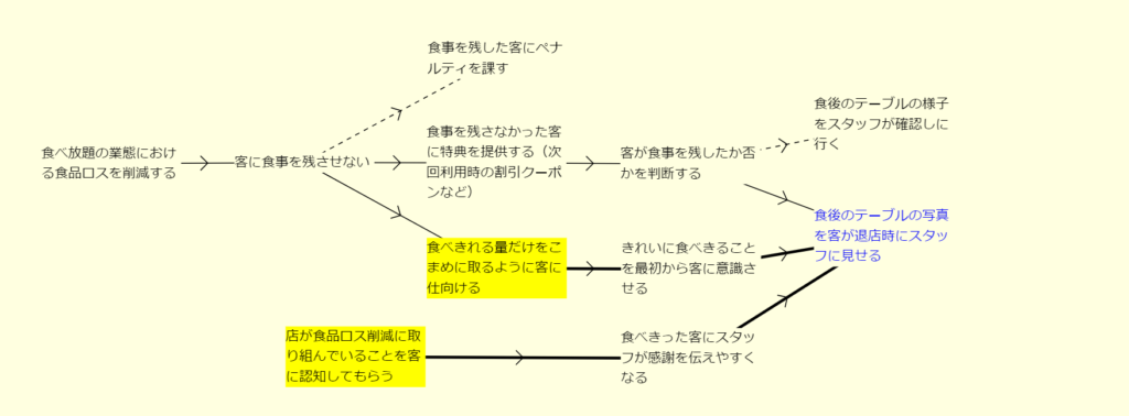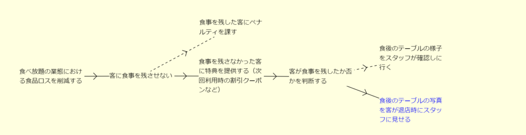 まず、この取り組みの概要を確認しておきましょう。「食べ放題の業態における食品ロスを削減する」という大目的があり、そのために「客に食事を残させない」という課題をいかにして解決するのか、というのが店としての検討テーマとなります。