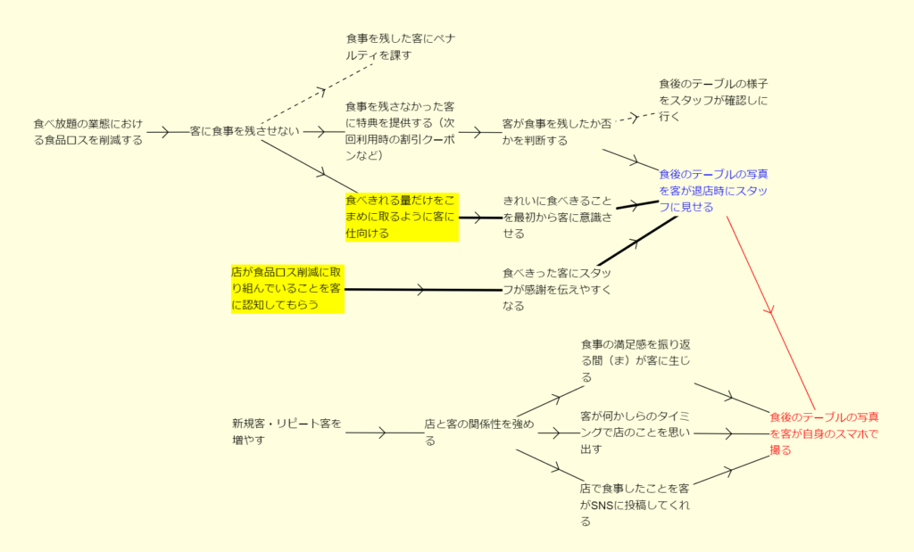 このように、この取り組みは、一見するとシンプルな一つのアイデアを起点としつつ、取り組み全体としての魅力や価値の高め方を色々と考えさせてくれる事例だと思いました。実際にしゃぶ葉の担当者の方がどのような順番で思考を拡げていかれたのかは分かりませんが、アイデアを導入することの効果が連鎖的に拡がり、その必要性についての意味づけもできる面白い取り組みだなと感じます。今回の内容をベースに、会計がセルフレジの場合だとどうすれば良いか、とか、写真の確認以外にもスタッフが客に感謝を伝えられる方法は無いか、などを考えてみるのも面白いのではないでしょうか。