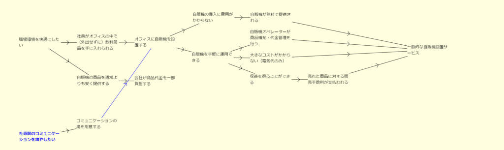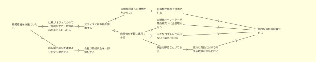 自販機設置サービスとは、「自販機の導入に費用がかからない」とか「自販機を手軽に運用できる」といった工夫が施されたサービスで、それにより「オフィスに自販機を設置する」ことができます。そして、それにより、「社員がオフィスの中で(外出せずに)飲料商品を手に入れられる」という課題を解決し、「職場環境を快適にしたい」という要求に応える、というのが基本的な構造です。さらには、職場環境をより快適にすることを目的として、「自販機の商品を通常よりも安く提供する」するために「会社が商品代金を一部負担する」ということを福利厚生で行っている企業も多くあります。
