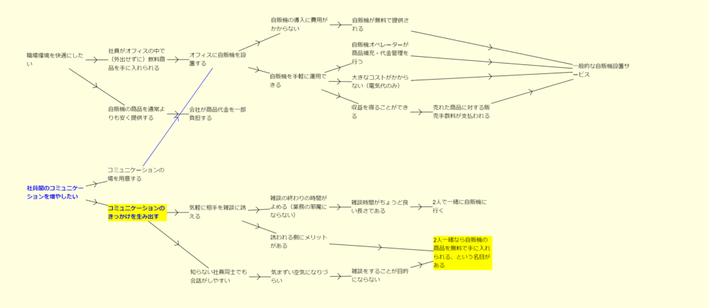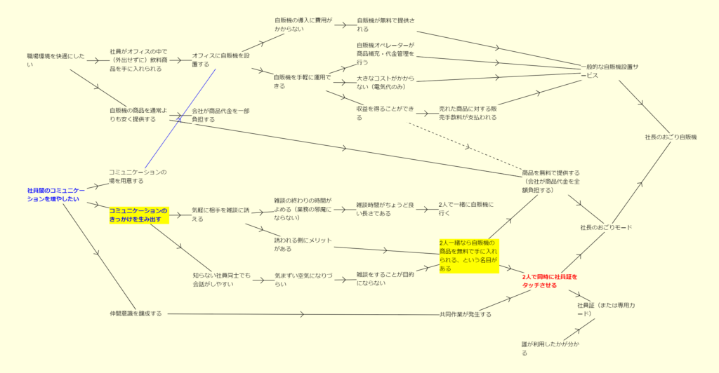 「コミュニケーションのきっかけを生み出す」には、「気軽に相手を雑談に誘える」ことが重要です。そのためには、「雑談の終わりの時間がよめる(業務の邪魔にならない)」ことが求められます。「2人で一緒に自販機に行く」というのは、「雑談時間がちょうど良い長さである」ので、もともとこのような課題を解決するのには適した方法でした。そして、社長のおごり自販機は、この課題をさらに解決するため、「2人一緒なら自販機の商品を無料で手に入れられる、という名目がある」ようにしたのです。