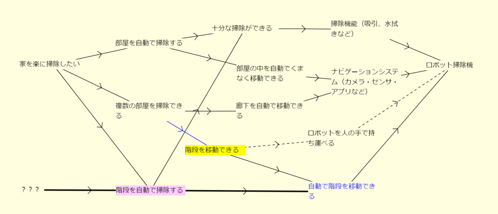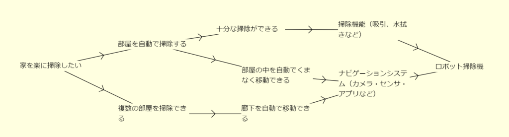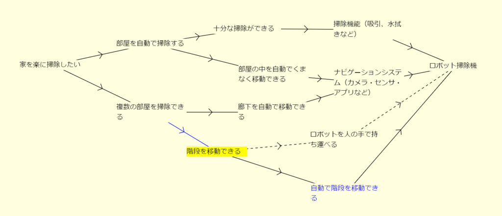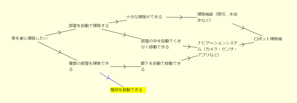 そこで、まず単純に思い浮かぶのは、もともとの機能である「十分な掃除ができる」と「階段を自動で移動できる」を組み合わせて、「階段を自動で掃除する」という機能を持たせられる、ということです。これは、「家を楽に掃除したい」という大元のニーズに直結し、その解決の度合いを高めることに貢献できると言えます。